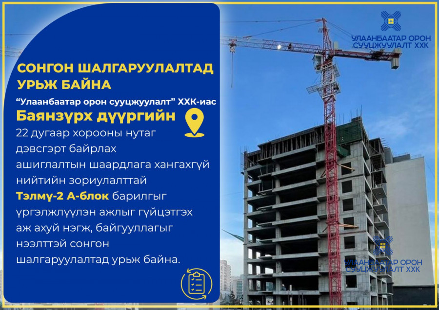 Нийслэлийн засаг даргын 2025 оны 08 дугаар сарын 19-ний өдрийн А/1145 дугаар захирамжийг үндэслэн ашиглалтын шаардлага хангахгүй орон сууцны барилгыг дахин төлөвлөж барилгажуулж, эхлүүлэх дараах байршил дээр барилгажилтын төсөл боловсруулж, барилгажилтын ажлыг гүйцэтгэх эрх бүхий аж ахуй нэгж байгууллагыг сонгох шалгаруулалтад урьж байна. Төслийн байршил Баянзүрх дүүргийн 22 дугаар хорооны нутаг дэвсгэрт байрлах ашиглалтын шаардлага хангахгүй нийтийн зориулалттай Тэлмү-2 А-блок барилга. Төсөл хэрэгжүүлэхийг сонирхож буй этгээд нь шалгаруулалтад оролцож, урилгад заагдсан төсөл хэрэгжүүлэгчийн сонгон шалгаруулалтын баримт бичгийг авах хүсэлтээ бичгээр ирүүлэх ба эргэн төлөгдөхгүй нөхцөлөөр 1,000,000 (нэг сая) төгрөгийн төлбөрийн баримтыг хавсаргасан байна.