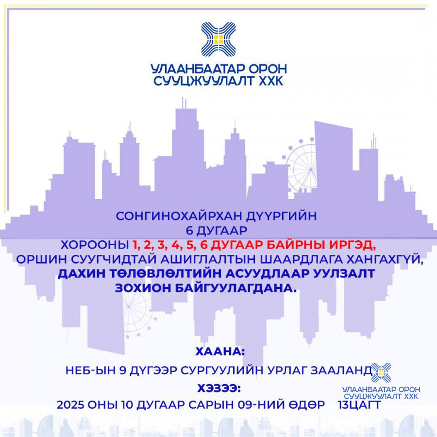 Сонгинохайрхан дүүргийн 6 дугаар хорооны 1, 2, 3, 4, 5, 6 дугаар байрны Иргэд, оршин суугчидтай АШИГЛАЛТЫН ШААРДЛАГА ХАНГАХГҮЙ, ДАХИН ТӨЛӨВЛӨЛТИЙН AСУУДЛААР УУЛЗАЛТ ЗОХИОН БАЙГУУЛАГДАНА.