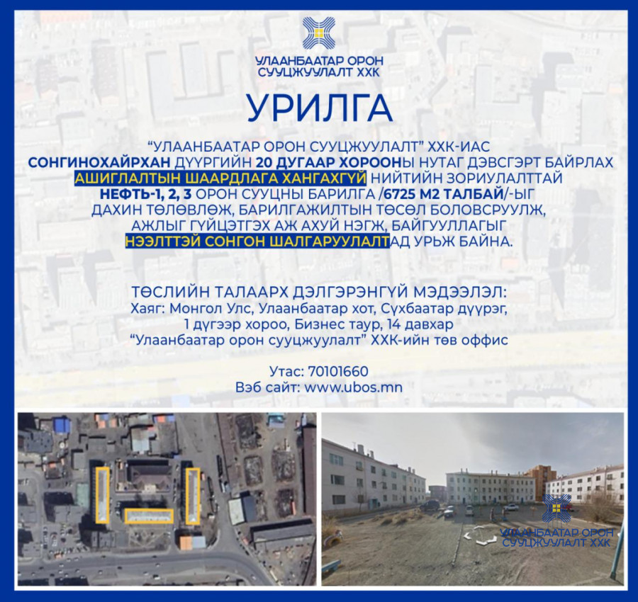Нийслэлийн засаг даргын 2025 оны 05 дугаар сарын 06-ны өдрийн А/635 дугаар захирамжийг үндэслэн ашиглалтын шаардлага хангахгүй орон сууцны барилгыг дахин төлөвлөж барилгажуулж, эхлүүлэх дараах байршил дээр барилгажилтын төсөл боловсруулж, барилгажилтын ажлыг гүйцэтгэх эрх бүхий аж ахуй нэгж байгууллагыг сонгох шалгаруулалтад урьж байна. Төслийн байршил Сонгинохайрхан дүүргийн 20 дугаар хорооны нутаг дэвсгэрт байрлах ашиглалтын шаардлага хангахгүй нийтийн зориулалттай Нефть-1, 2, 3 дугаар орон сууцны барилга 6725 м2 талбай. Төсөл хэрэгжүүлэхийг сонирхож буй этгээд нь шалгаруулалтад оролцож, урилгад заагдсан төсөл хэрэгжүүлэгчийн сонгон шалгаруулалтын баримт бичгийг авах хүсэлтээ бичгээр ирүүлэх ба эргэн төлөгдөхгүй нөхцөлөөр 1,000,000 (нэг сая) төгрөгийн төлбөрийн баримтыг хавсаргасан байна.