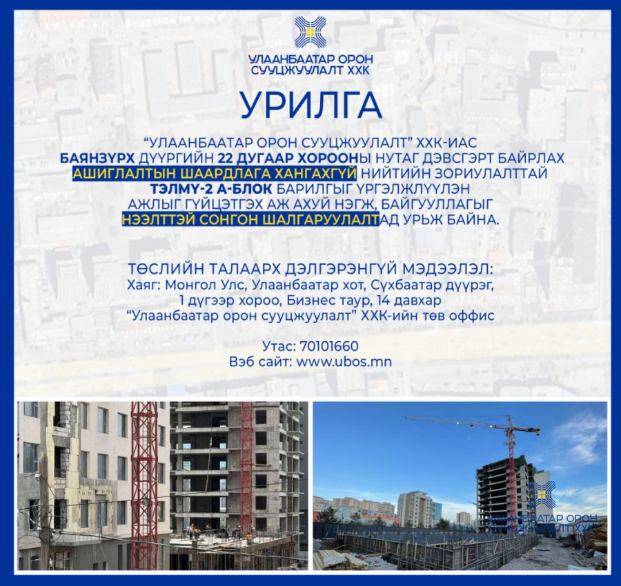 Нийслэлийн засаг даргын 2025 оны 08 дугаар сарын 19-ний өдрийн А/1145 дугаар  захирамжийг үндэслэн ашиглалтын шаардлага хангахгүй орон сууцны барилгыг дахин төлөвлөж барилгажуулж, эхлүүлэх дараах байршил дээр барилгажилтын төсөл боловсруулж, барилгажилтын ажлыг гүйцэтгэх эрх бүхий аж ахуй нэгж байгууллагыг сонгох шалгаруулалтад урьж байна. Төслийн байршил Баянзүрх дүүргийн 22 дугаар хорооны нутаг дэвсгэрт байрлах ашиглалтын шаардлага хангахгүй нийтийн зориулалттай Тэлмү-2 А-блок барилга. Төсөл хэрэгжүүлэхийг сонирхож буй этгээд нь шалгаруулалтад оролцож, урилгад заагдсан төсөл хэрэгжүүлэгчийн сонгон шалгаруулалтын баримт бичгийг авах хүсэлтээ бичгээр ирүүлэх ба эргэн төлөгдөхгүй нөхцөлөөр 1,000,000 (нэг сая) төгрөгийн төлбөрийн баримтыг хавсаргасан байна.