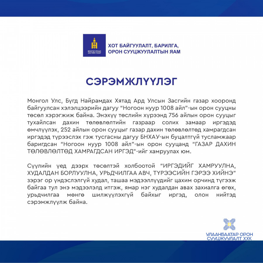 "Ногоон нуур 1008 айл"-ын орон сууцанд иргэдийг хамруулна, худалдан борлуулна, урьдчилгаа авч түрээсийн гэрээ хийнэ зэрэг ор үндэслэлгүй, худал, ташаа мэдээллүүдийг цахим орчинд түгээж байна.