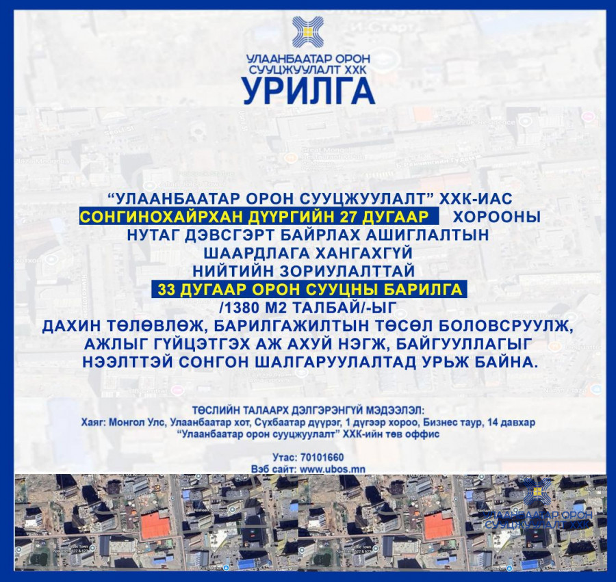 Нийслэлийн засаг даргын 2025 оны 05 дугаар сарын 27-ны өдрийн А/734 дүгээр  захирамжийг үндэслэн ашиглалтын шаардлага хангахгүй орон сууцны барилгыг дахин төлөвлөж барилгажуулж, эхлүүлэх дараах байршил дээр барилгажилтын төсөл боловсруулж, барилгажилтын ажлыг гүйцэтгэх эрх бүхий аж ахуй нэгж байгууллагыг сонгох шалгаруулалтад урьж байна. Төслийн байршил Сонгинохайрхан дүүргийн 27 дугаар хорооны нутаг дэвсгэрт байрлах ашиглалтын шаардлага хангахгүй нийтийн зориулалттай 33 дугаар орон сууцны барилга 1380 м2 талбай. Төсөл хэрэгжүүлэхийг сонирхож буй этгээд нь шалгаруулалтад оролцож, урилгад заагдсан төсөл хэрэгжүүлэгчийн сонгон шалгаруулалтын баримт бичгийг авах хүсэлтээ бичгээр ирүүлэх ба эргэн төлөгдөхгүй нөхцөлөөр 1,000,000 (нэг сая) төгрөгийн төлбөрийн баримтыг хавсаргасан байна.