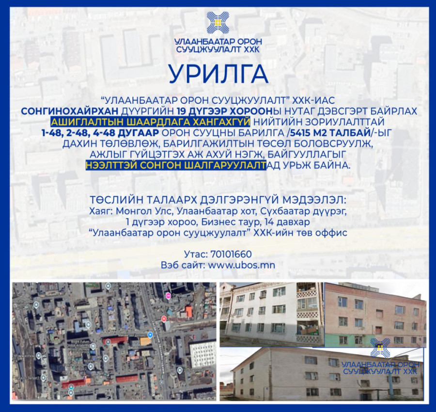 Нийслэлийн засаг даргын 2025 оны 03 дугаар сарын 24-ний өдрийн А/358 дугаар захирамжийг үндэслэн ашиглалтын шаардлага хангахгүй орон сууцны барилгыг дахин төлөвлөж барилгажуулж, эхлүүлэх дараах байршил дээр барилгажилтын төсөл боловсруулж, барилгажилтын ажлыг гүйцэтгэх эрх бүхий аж ахуй нэгж байгууллагыг сонгох шалгаруулалтад урьж байна. Төслийн байршил Сонгинохайрхан дүүргийн 19 дүгээр хорооны нутаг дэвсгэрт байрлах ашиглалтын шаардлага хангахгүй нийтийн зориулалттай 1-48, 2-48, 4-48 дугаар орон сууцны барилга 5415 м2 талбай. Төсөл хэрэгжүүлэхийг сонирхож буй этгээд нь шалгаруулалтад оролцож, урилгад заагдсан төсөл хэрэгжүүлэгчийн сонгон шалгаруулалтын баримт бичгийг авах хүсэлтээ бичгээр ирүүлэх ба эргэн төлөгдөхгүй нөхцөлөөр 1,000,000 (нэг сая) төгрөгийн төлбөрийн баримтыг хавсаргасан байна.